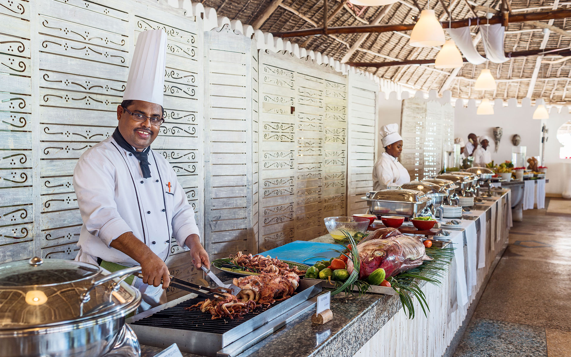 Serves breakfast, lunch and dinner buffet style offering local dishes,